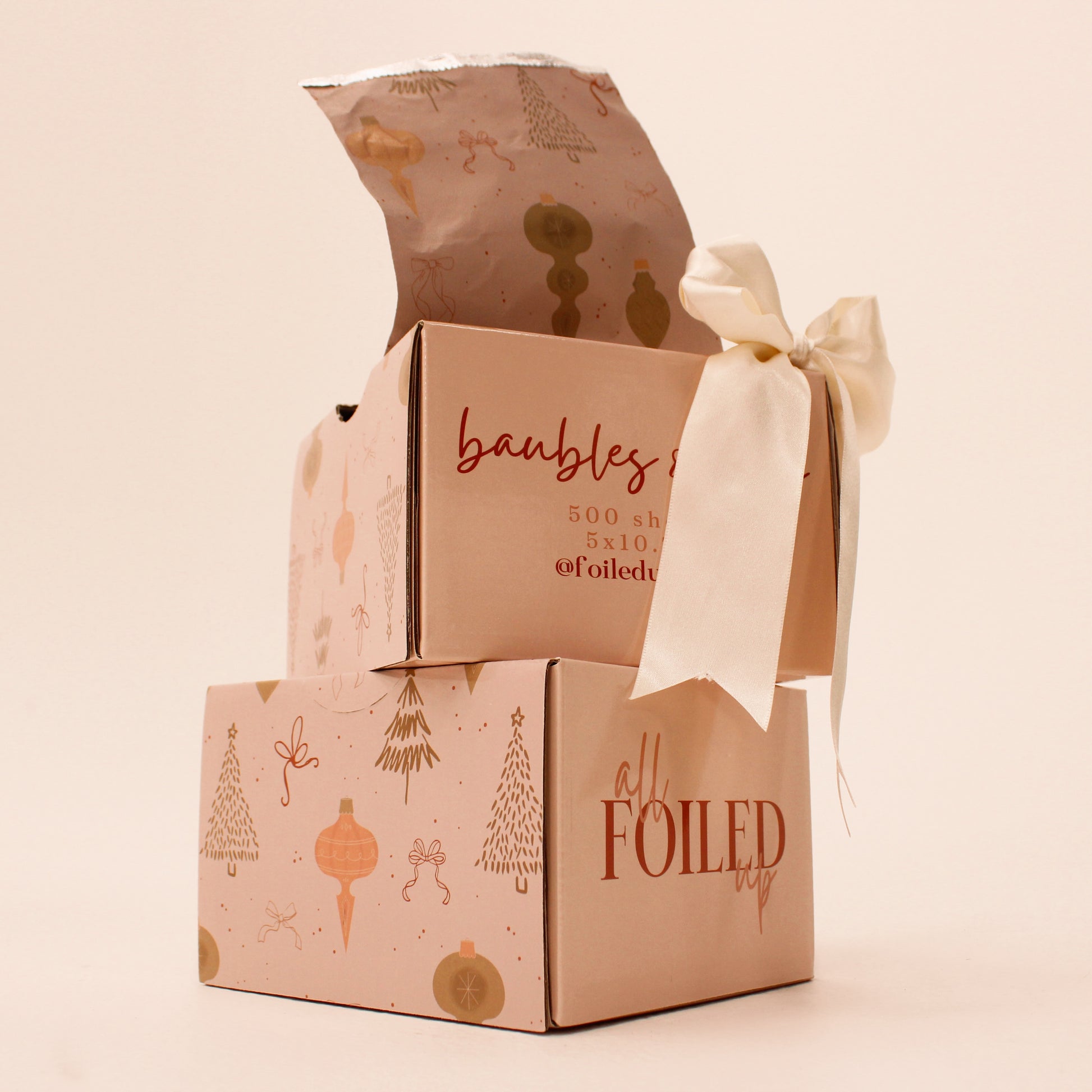 Baubles & Bows is our take on a pretty-in-pink holiday! Light pink background with peachy pink & sage colored ornaments, evergreen trees, and terracotta bows. Guaranteed to make that holiday rush more enjoyable!